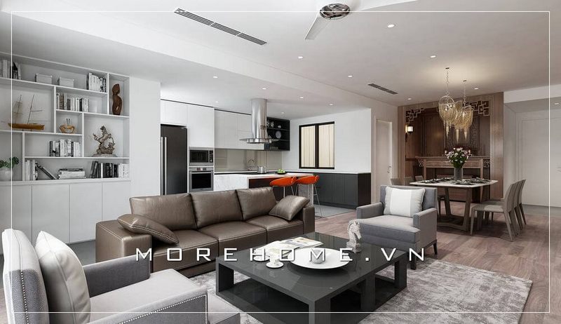 Bộ sofa bọc da cao cấp dành cho phòng khách chung cư bao gồm 2 ghế đơn màu ghi xám và 1 dài màu nâu tây giúp tạo điểm nhấn cho không gian.